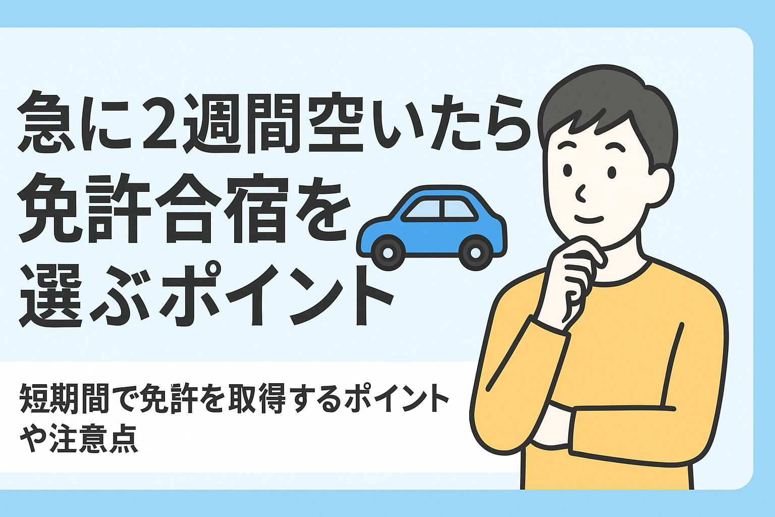 免許合宿の予約は基本的に余裕を持って行うのが理想ですが、現実的には「急に2週間だけ時間が空いた」という状況もあります。その限られた期間をどう生かして合宿を選ぶか、また注意しておきたいリスクやポイントについてまとめます。 免許合宿は短期間で... -