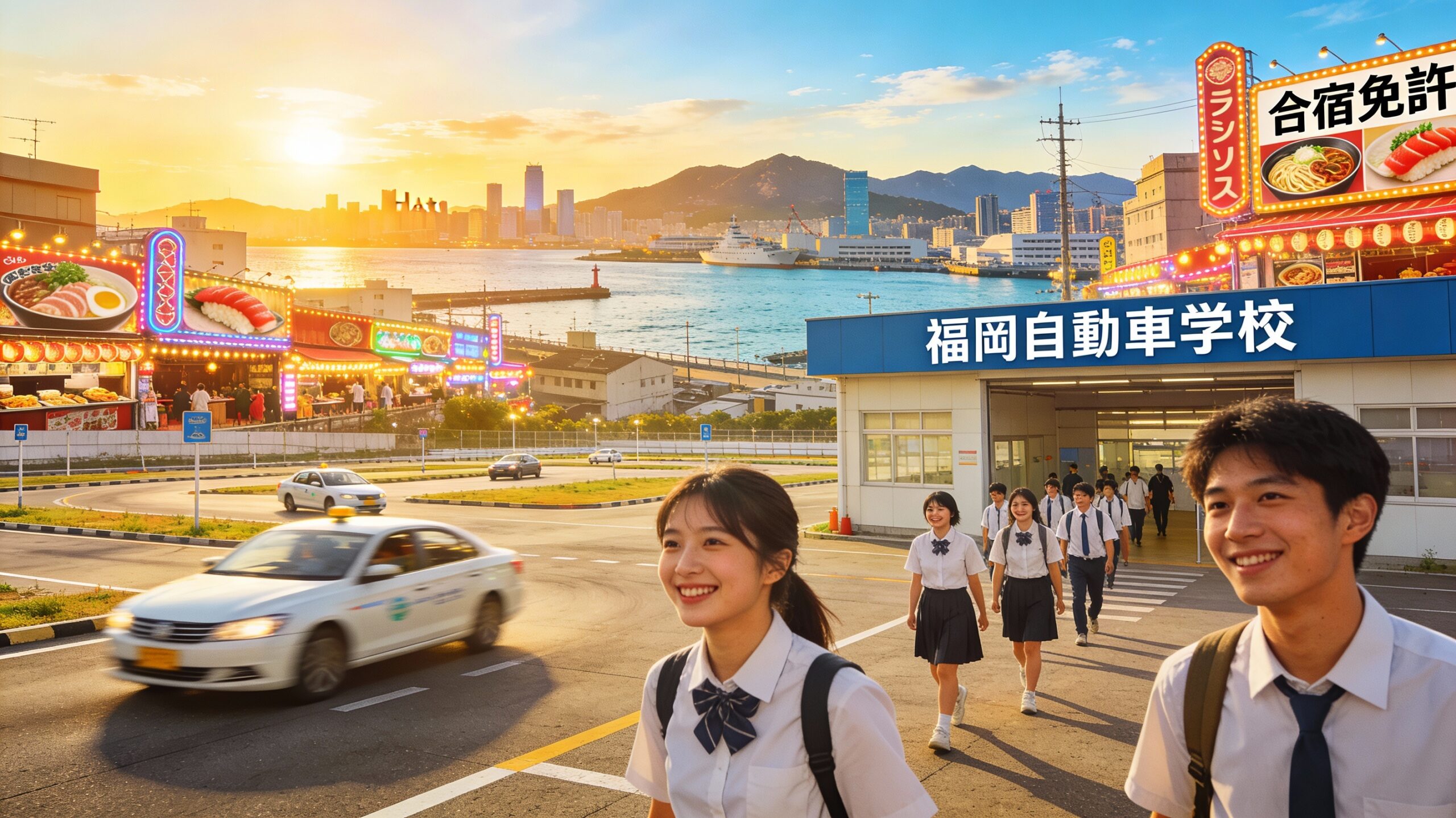 全国でブームの合宿免許、福岡県で始めるなら今です。博多駅から電車でサクッとアクセス抜群、明太子や屋台グルメを満喫しながら最短2週間で免許ゲットするのはいかがですか。